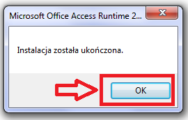 14. Drugie okno - informujące o zainstalowaniu dodatku Access Runtime (naciśnięcie na 'OK' spowoduje zakończenie instalacji).