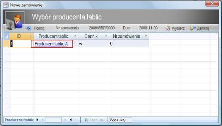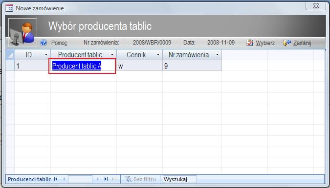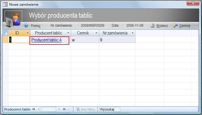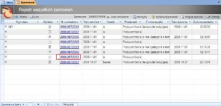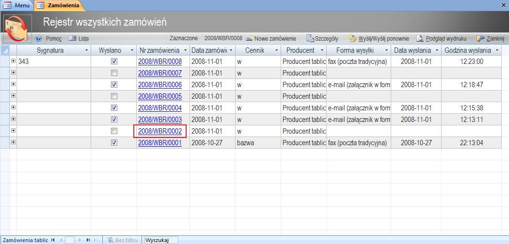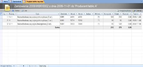 Ułatwienie to umożliwia wygodniejsze przeglądanie pojedynczych zamówień. Wystarczy kliknąć na link zamówienia, by je 'otworzyć', tzn. otworzyć w nowym formularzu jego zawartość. W podobny sposób można 'otwierać' tablice przyjęte w dniu..., przyjęcie tablic wg dostawców, protokoły jakości, protokoły przekazania wycofanych tablic itp.