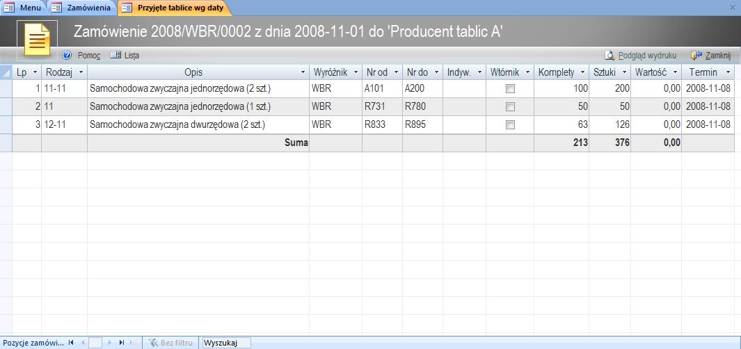 - wprowadzenie nowych zestawień (np. raport zamówień, wyprodukowanych tablic wg daty przyjęcia itd.),