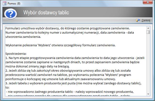 Każdy formularz programu został wzbogacony o pomoc. Znajdują się w niej opisy funkcji i zastosowanych rozwiązań oraz praktyczne spostrzeżenia, które mają na celu ułatwić korzystanie z programu.